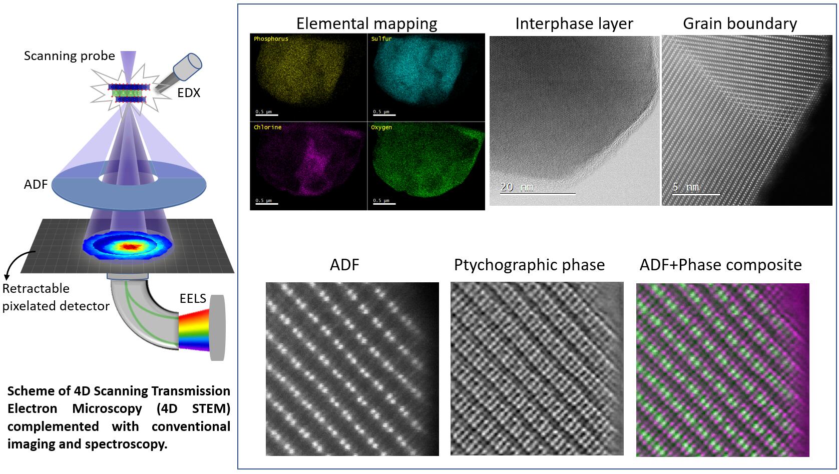 Our group pioneers advanced transmission electron microscopy (TEM) techniques to answer fundamental materials questions from the atomic scale up. While we maintain expertise in conventional imaging, energy-dispersive X-ray spectroscopy (EDX), and electron energy-loss spectroscopy (EELS), we are particularly invested in developing and applying cutting-edge methods such as 4D STEM ptychography and nanobeam diffraction.3. Multi-length-scale Probing Using Synchrotron X-rays and Machine Learning